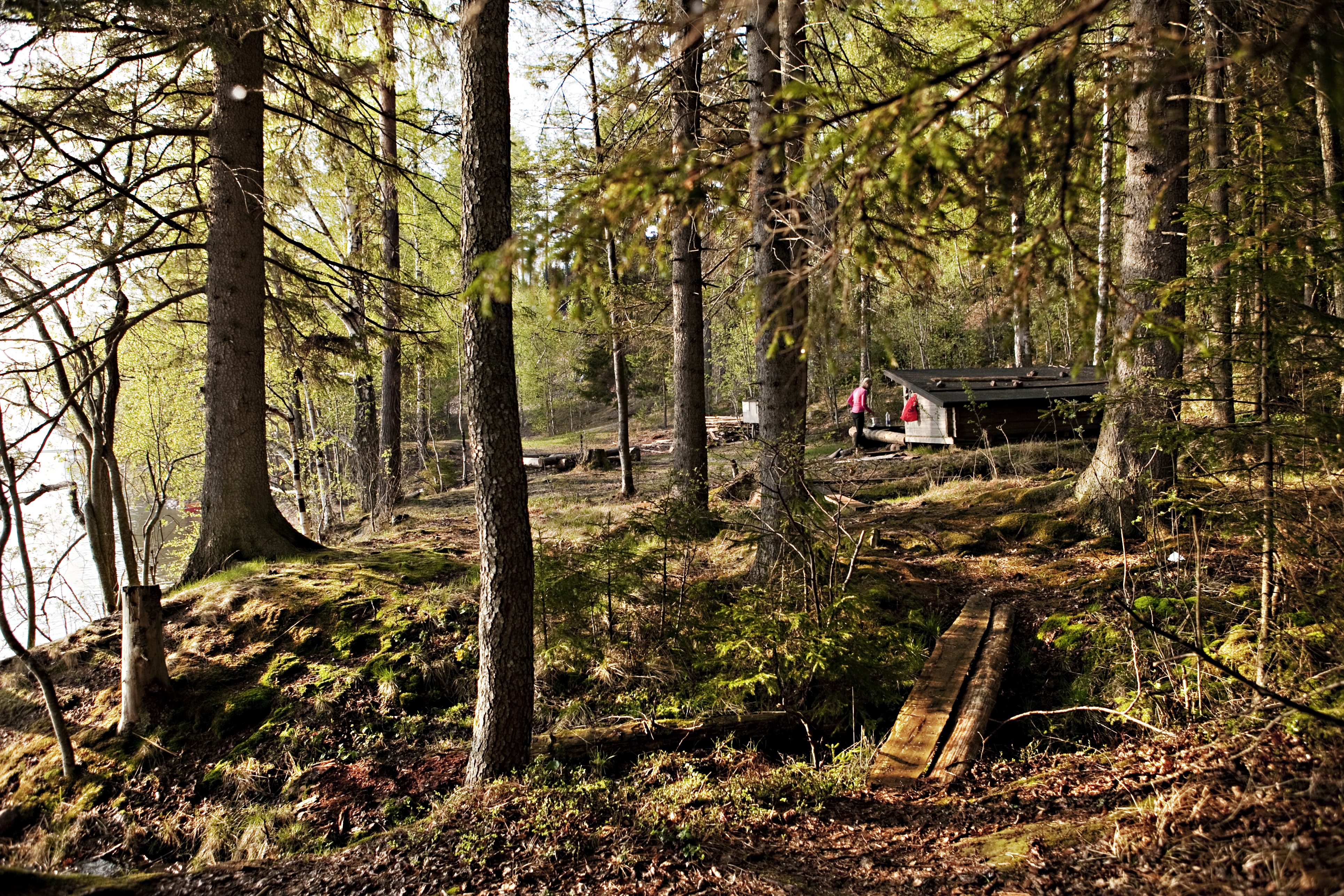Vi tar sikte på en lägerplats. Den vi valt ut ligger vackert i en glänta. Där finns inte mycket mer än enkel eldplats och lite ved så nu gäller det att bemästra vildmarken och ordna mat och husrum.