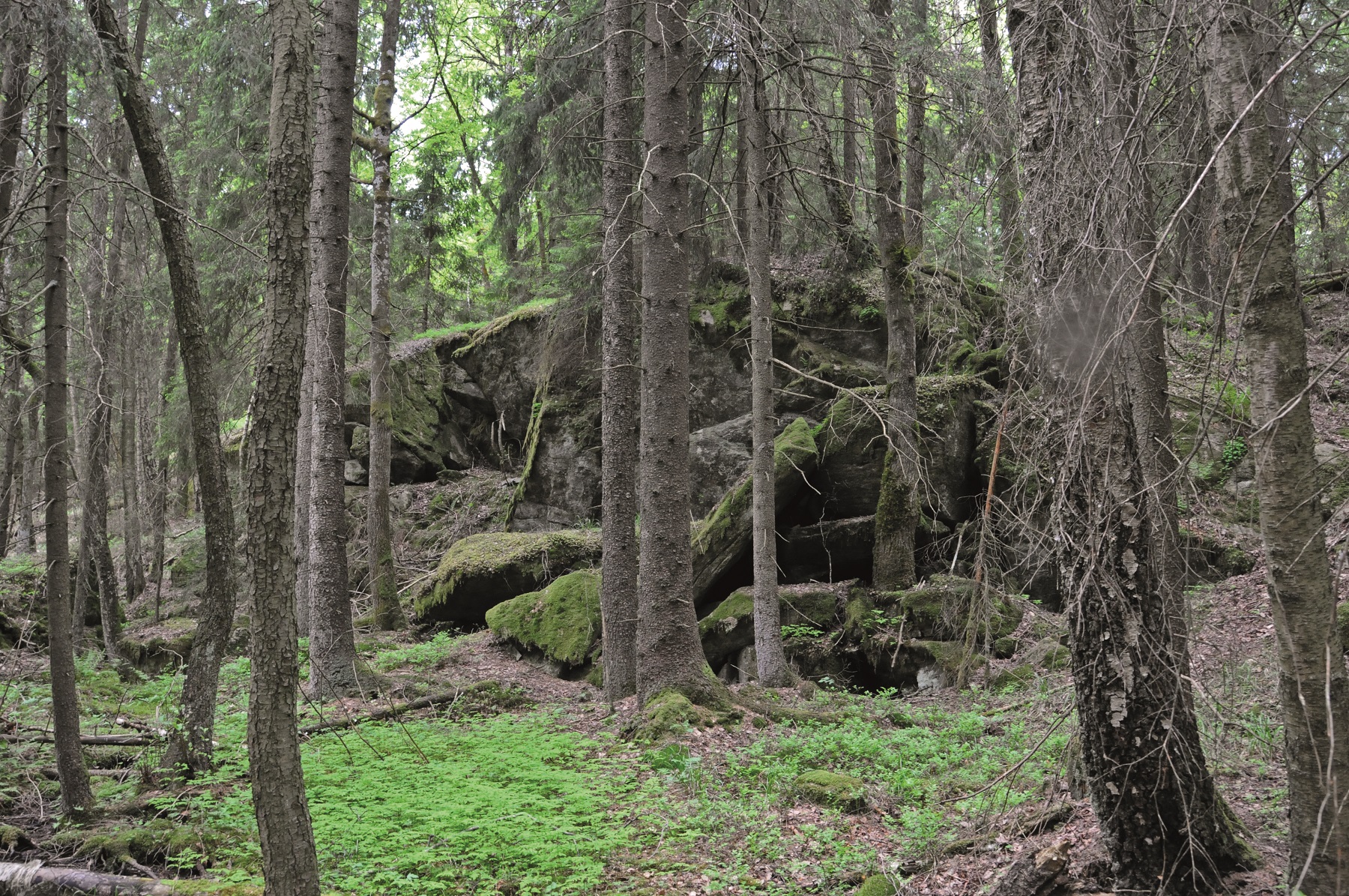 Eftersom det inte bedrivits något storskaligt skogsbruk i området finns här arter som inte klarar den dramatiska miljöförändring som kalhuggning innebär. Skärmstarr, kambräken, blylav och kandelabersvamp är några exempel. Under barken på gamla, döende granar finns gott om insektslarver. Här kan man ibland se spåren efter den tretåiga hackspettens födosök.