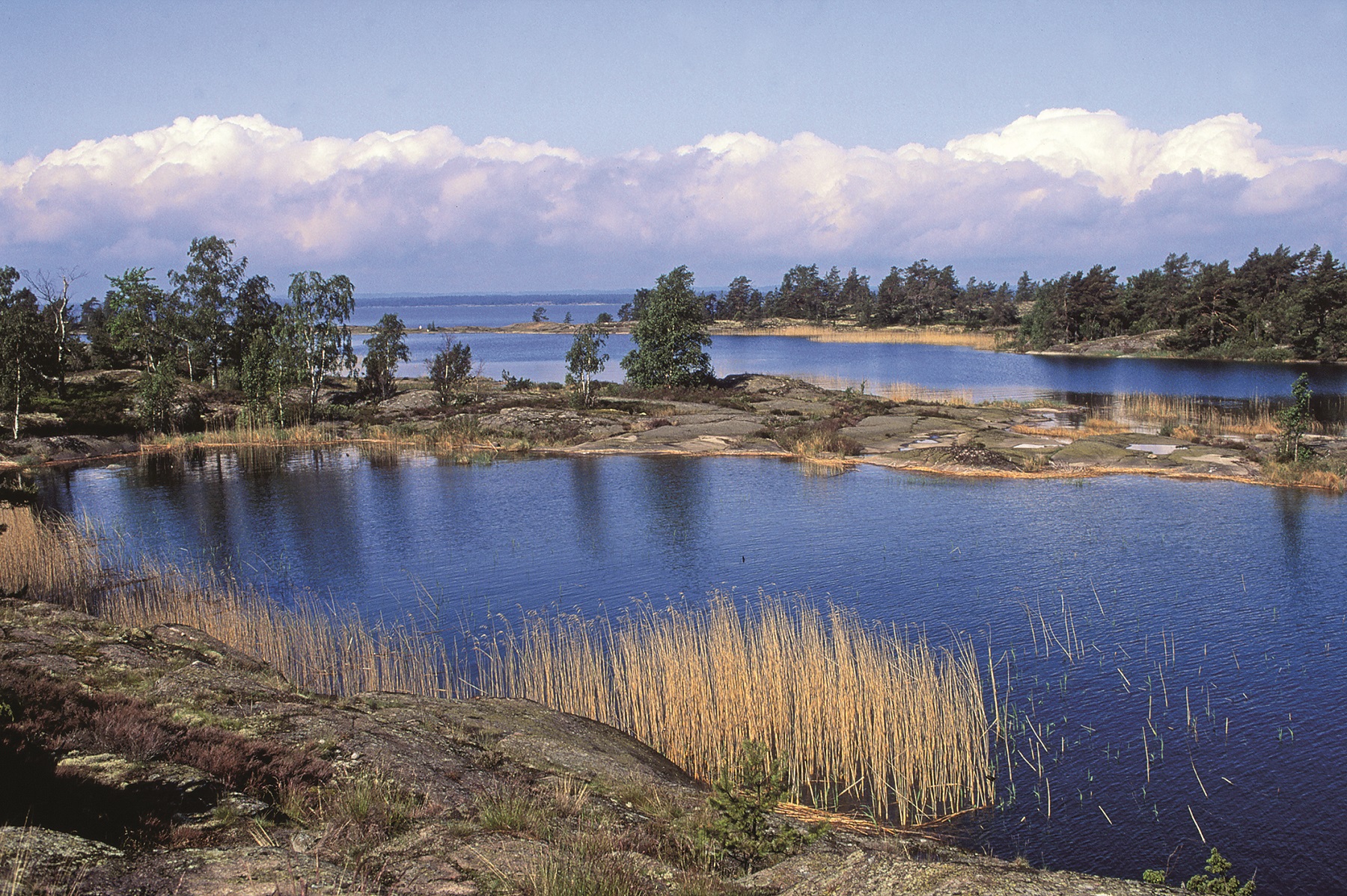 På steniga stränder trippar drillsnäppan och i vassen sjunger sävsparv och rörsångare.