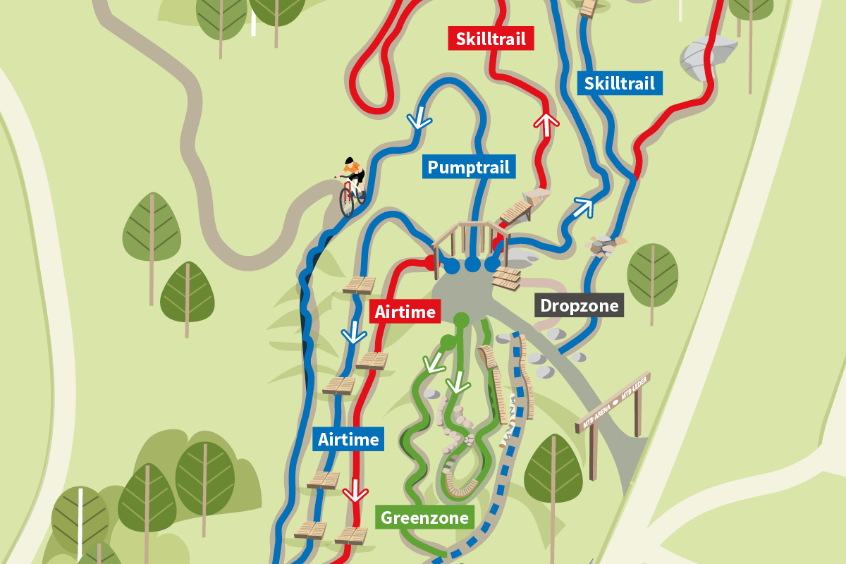 Billingen's MTB arena is the heart of the trail network. A compact area with shorter trails in green, blue, and red levels. The focus here is on jumps and technique, with fun pump tracks, technical trails, jump trails, and of course, drop zones and jump zones. The MTB arena also features great spots for rest, with opportunities for grilling, fika, and hanging out with friends and family. All MTB trails start from here.