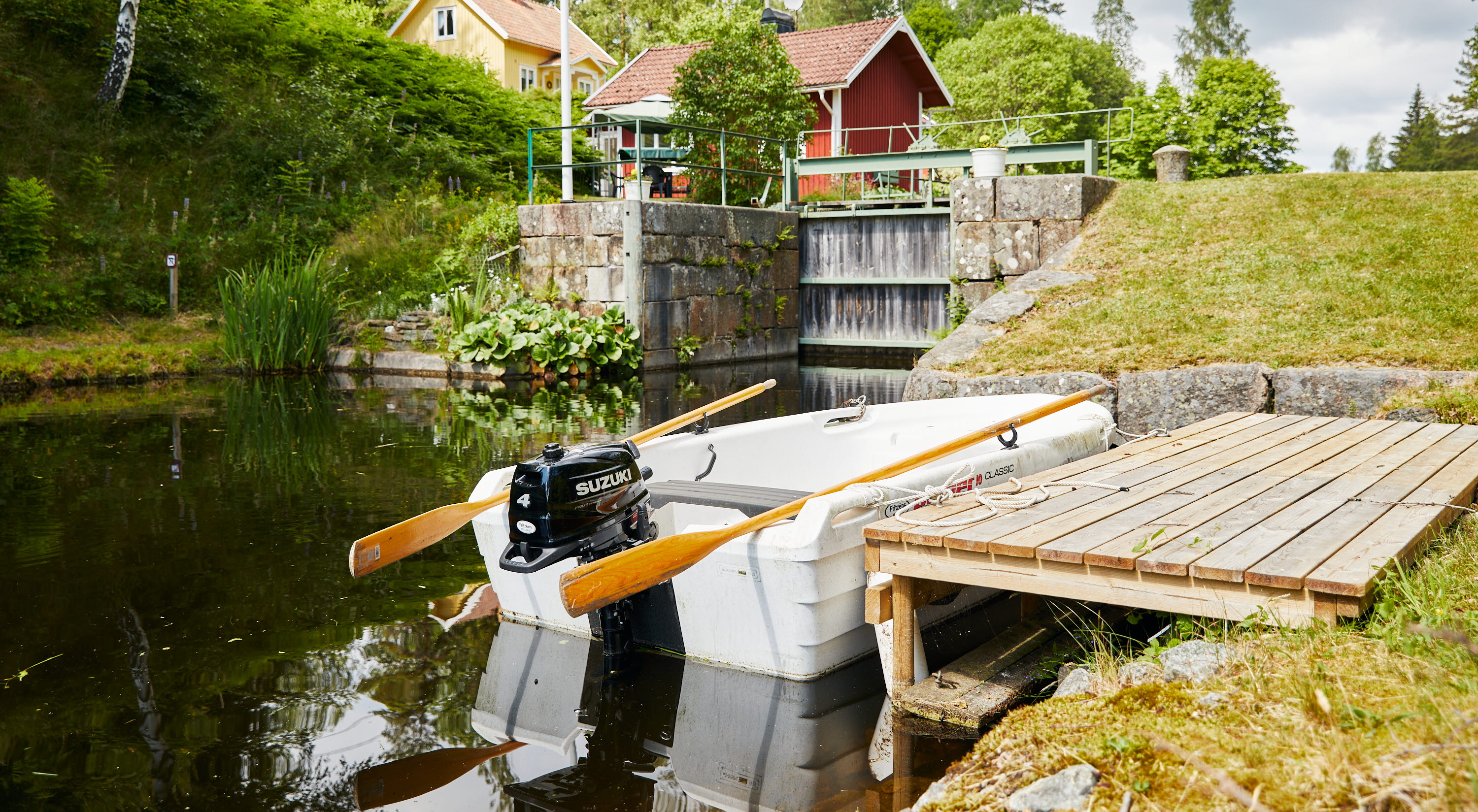 Just below the cottage you will find the boat with oars and engine. Fuel is not included so you need to refill the fuel tank before leaving the cottage. As a guest in our Lock keeper cottages you can travel through the locks of the canal for free during the summer. Please observe that we will take out the boat during the vinter time.To the south you can go to Håverud with restaurants and the famous aqueduct. If you travel north you can visit the rock carvings in Högsbyn or eat ice cream in Långbron.