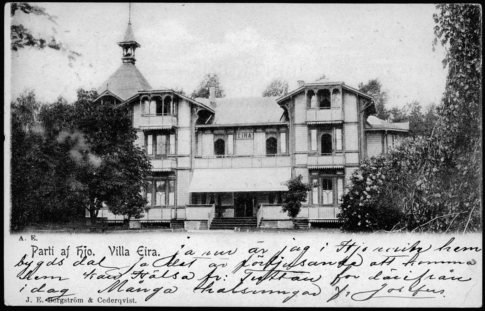 Villa Eira stod klar 1892 och är ritad av arkitekt Adrian Crispin Peterson. Den var avsedd som bostads för sommargäster som besökte Hjo Vattenkuranstalt.