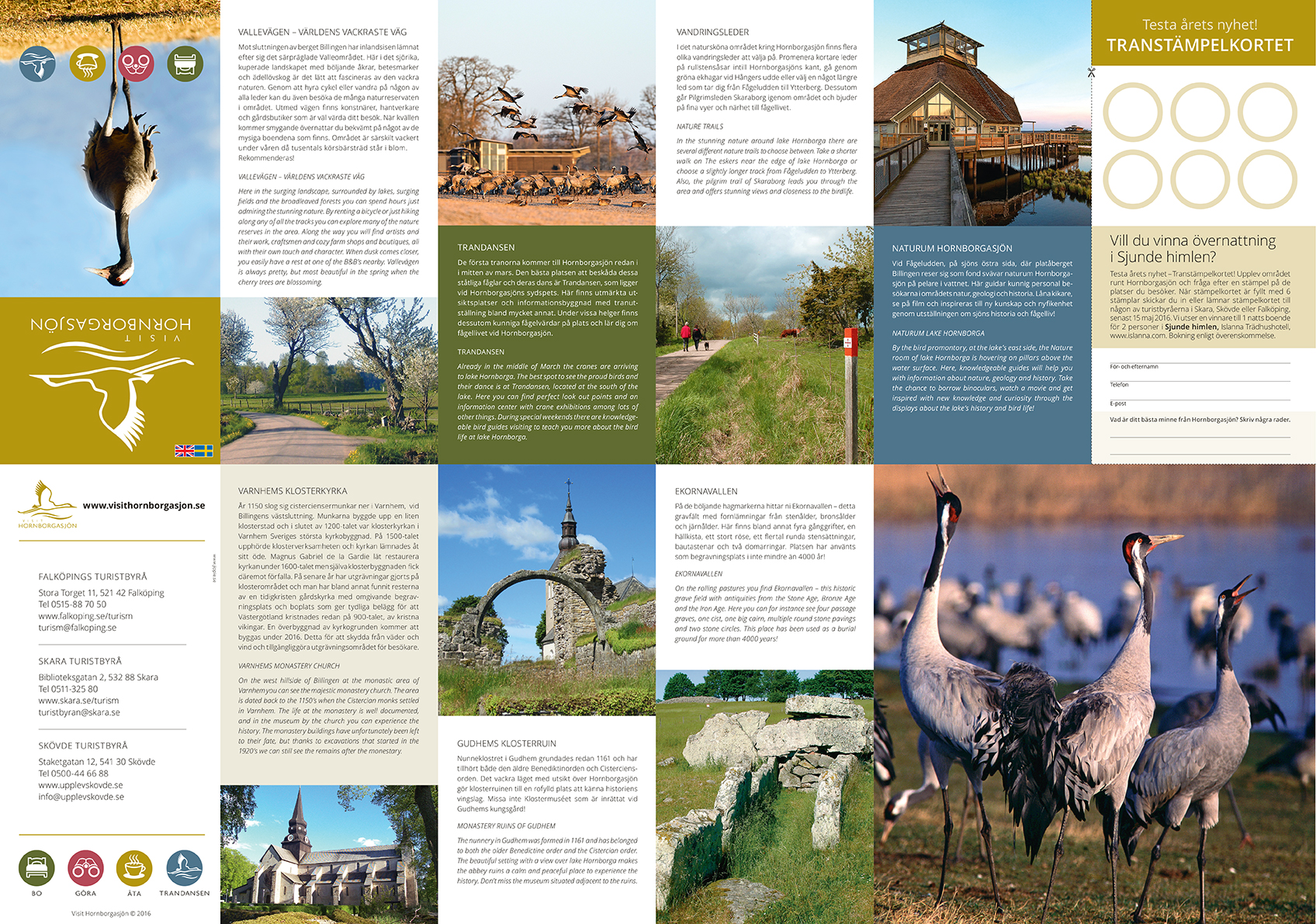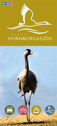 Karta över området runt Hornborgasjön med besöksmål, boende och matställen.
