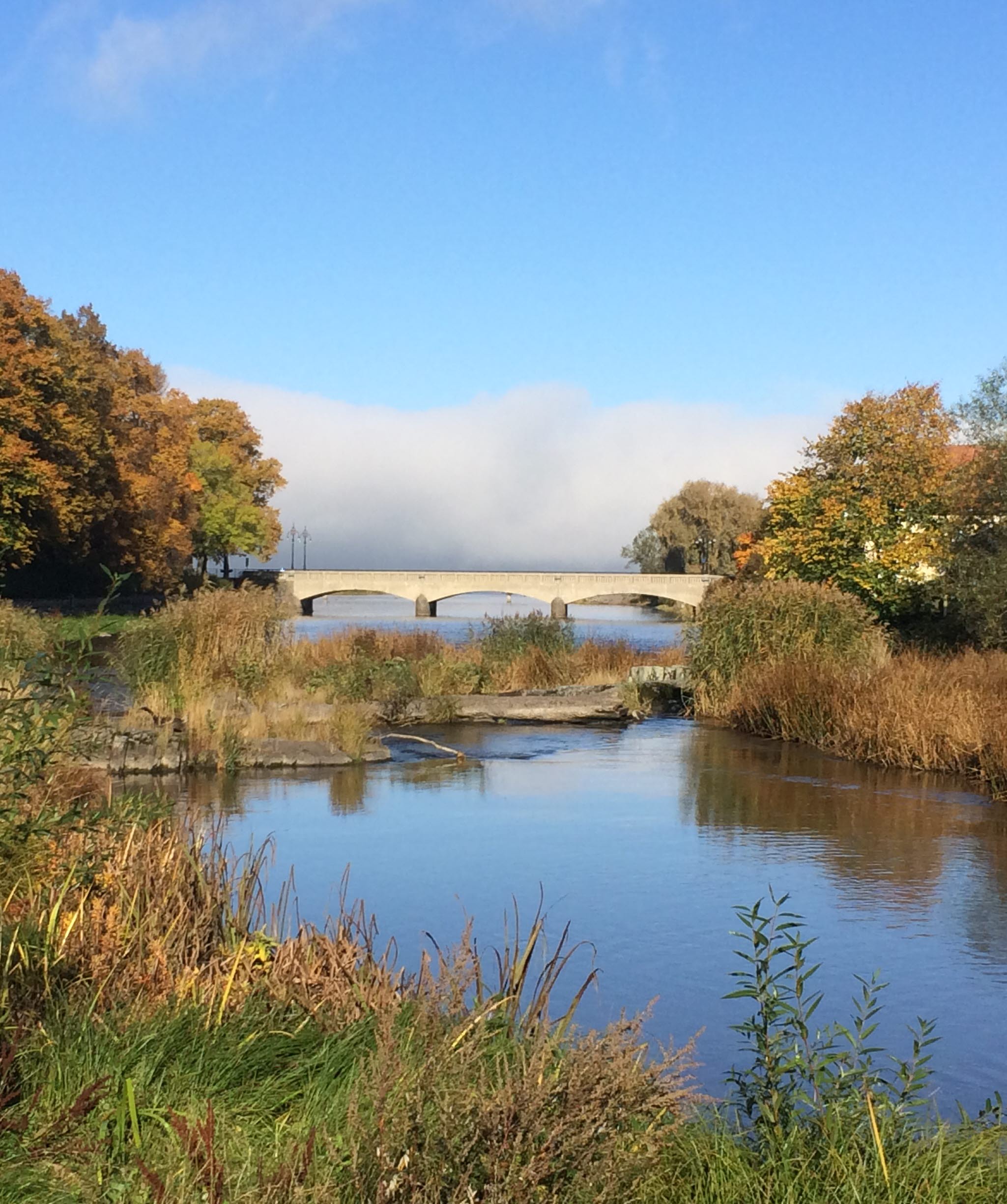Promenaden över fyra broar i centrala Mariestad går både längs med och över ån Tidan. Vandringen är vacker och bjuder på både historiska miljöer och naturupplevelser.