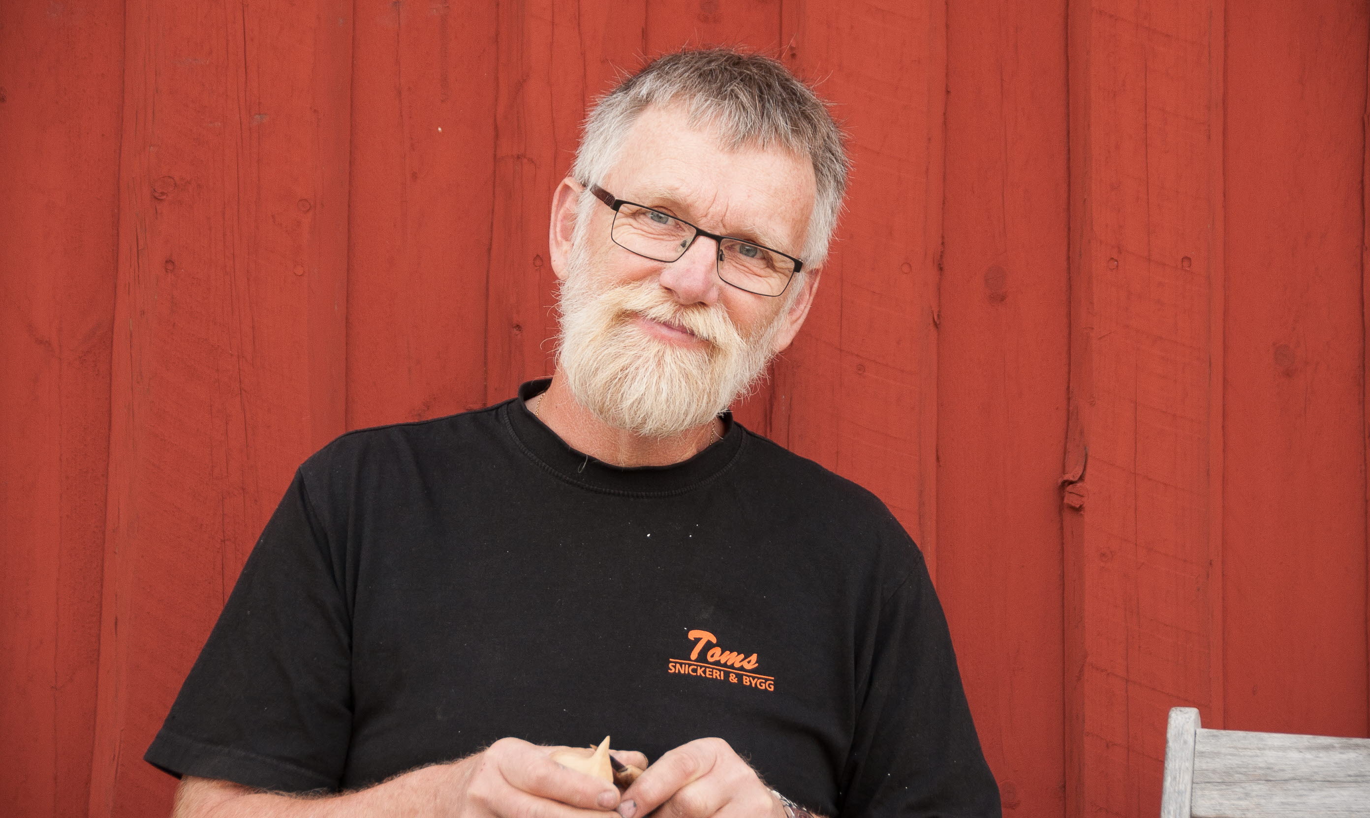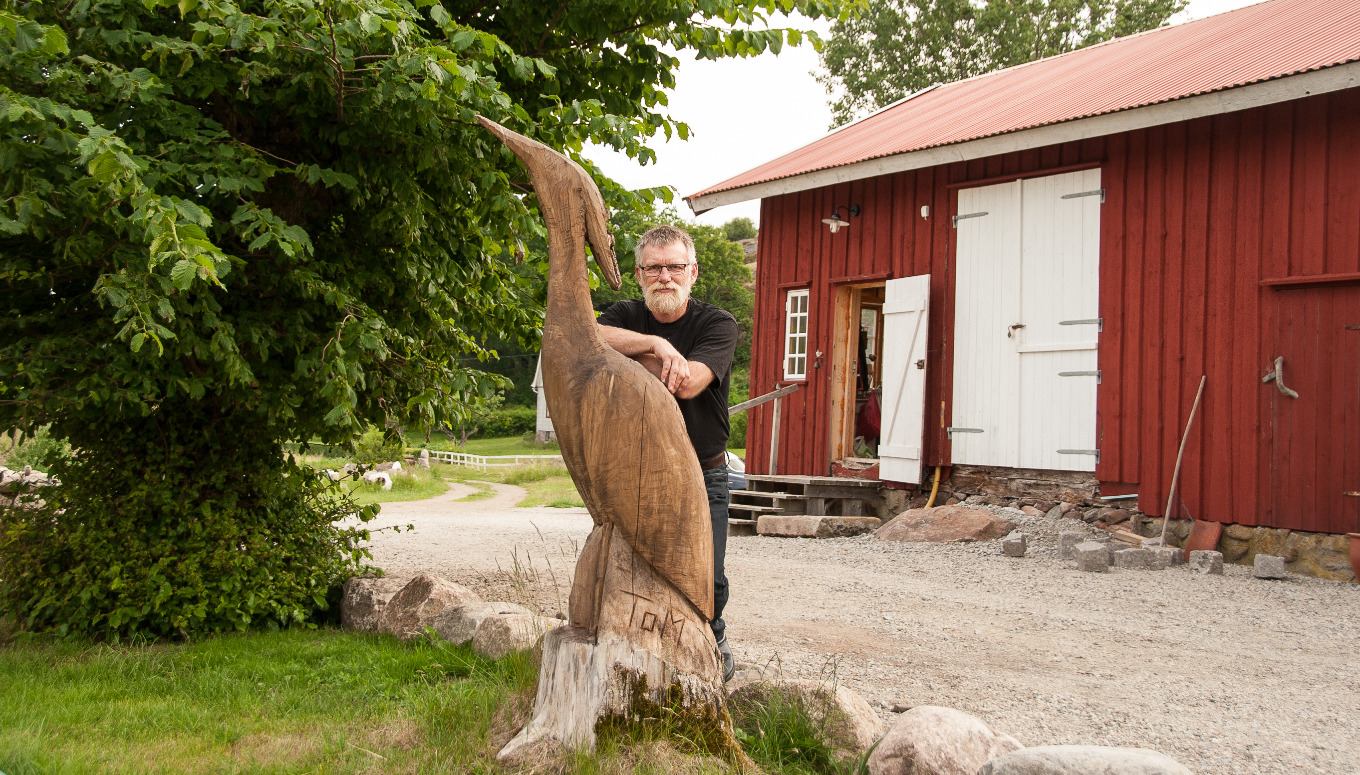 På tomten finns också den röda ladan, där Tom i ena ändan har sin snidarverkstad. Här finns många spännande verktyg, fåglar och figurer i olika stadier av tillverkning. I ladan planerar han så småningom att göra en utställningslokal, att bjuda in andra träsnidare och konstnärer och öppna för allmänheten.