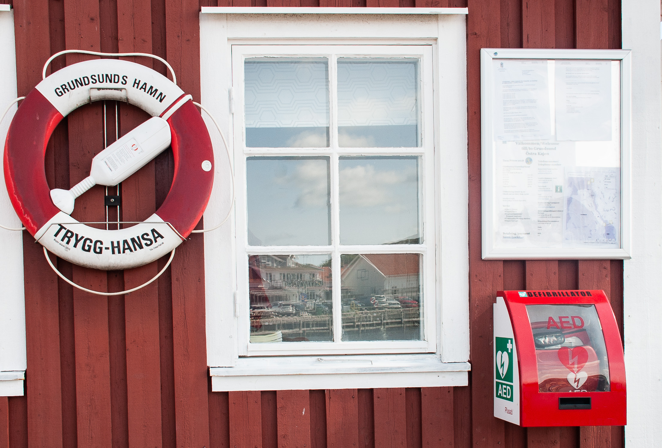 9. Hjärtstartare Östra Kajen Grundsund - Utsidan i värmeskåp på gästhamnskontorets röda byggnad. Alltid tillgänglig.- I Hjärtstartarregistret