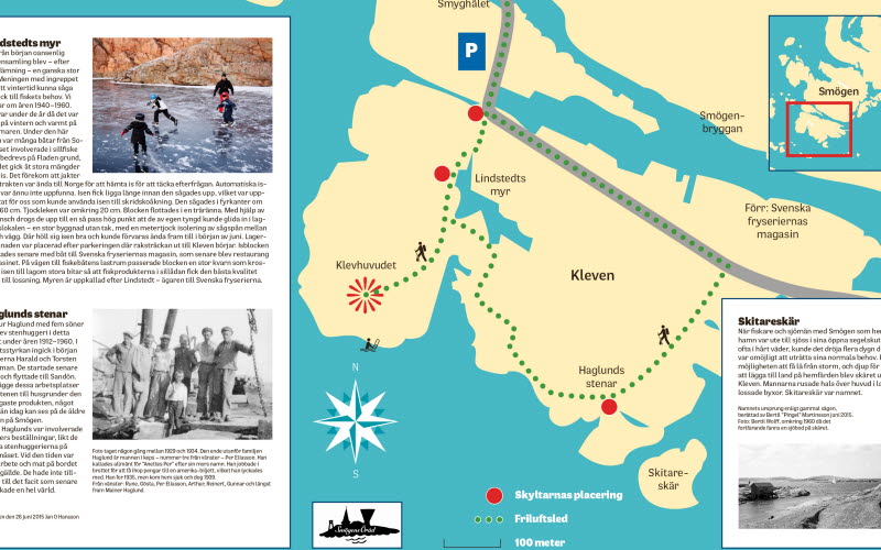 Följ huvudled genom Smögen och vid torget ta höger. Kör tills du kommer till parkeringsplats, först på vänster sida och lite senare kommer en parkering på höger sida. Här börjar Kleven området. Se på kartan hur leden går. Vid Lindstedts myr, en sötvattensmyr där man förr sågade loss isblock som användes för att förvara fisk , är under vintern ett perfekt ställe för skridskoåkning när vädret tillåter. Leden erbjuder vacker utsikt och granit när den är som bäst.