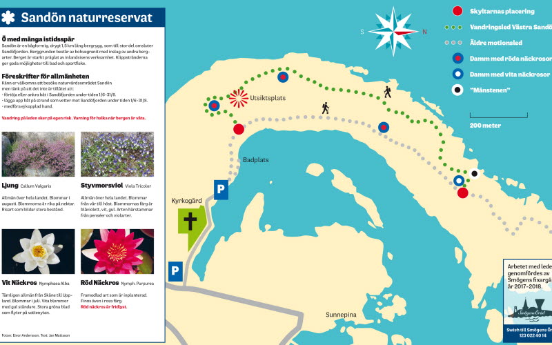När man kommit av Smögenbron på Smögensidan tar du första avtagsväg till höger mot Hasselösund. Kör denna väg och ta sedan tredje avtagsvägen till vänster. Kör så långt du kan och parkera. Här ligger en fin badplats med sandstrand och vandringsleden går ut på klipporna med en otrolig utsikt över havet. Längs leden finns flera dammar med vita och röda näckrosor under säsong. Sandön är ett naturreservat och regler enligt skyltar ska följas.