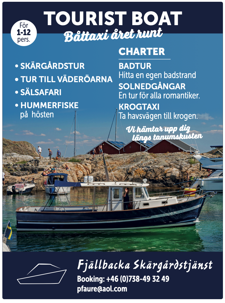 Boka vår fina båt som båttaxi eller för en chartrad tur i Fjällbacka! Vi hämtar upp längs hela Tanumskusten och vår båttaxi går att boka året runt. Med en privat båttur så bestämmer du själv vart du ska åka och hur länge du vill stanna. Det finns så många fina öar att se och mysiga platser att lägga till vid här i vår skärgård.