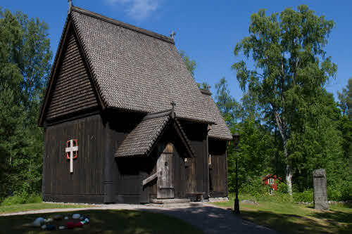 Skaga. I Tiveden ligger mytomspunna Skaga stavkyrka. En björnfäll som kormatta, silverlöjan över predikstolen och en urholkad ekstock hör enligt tradition och säger till kyrkan.