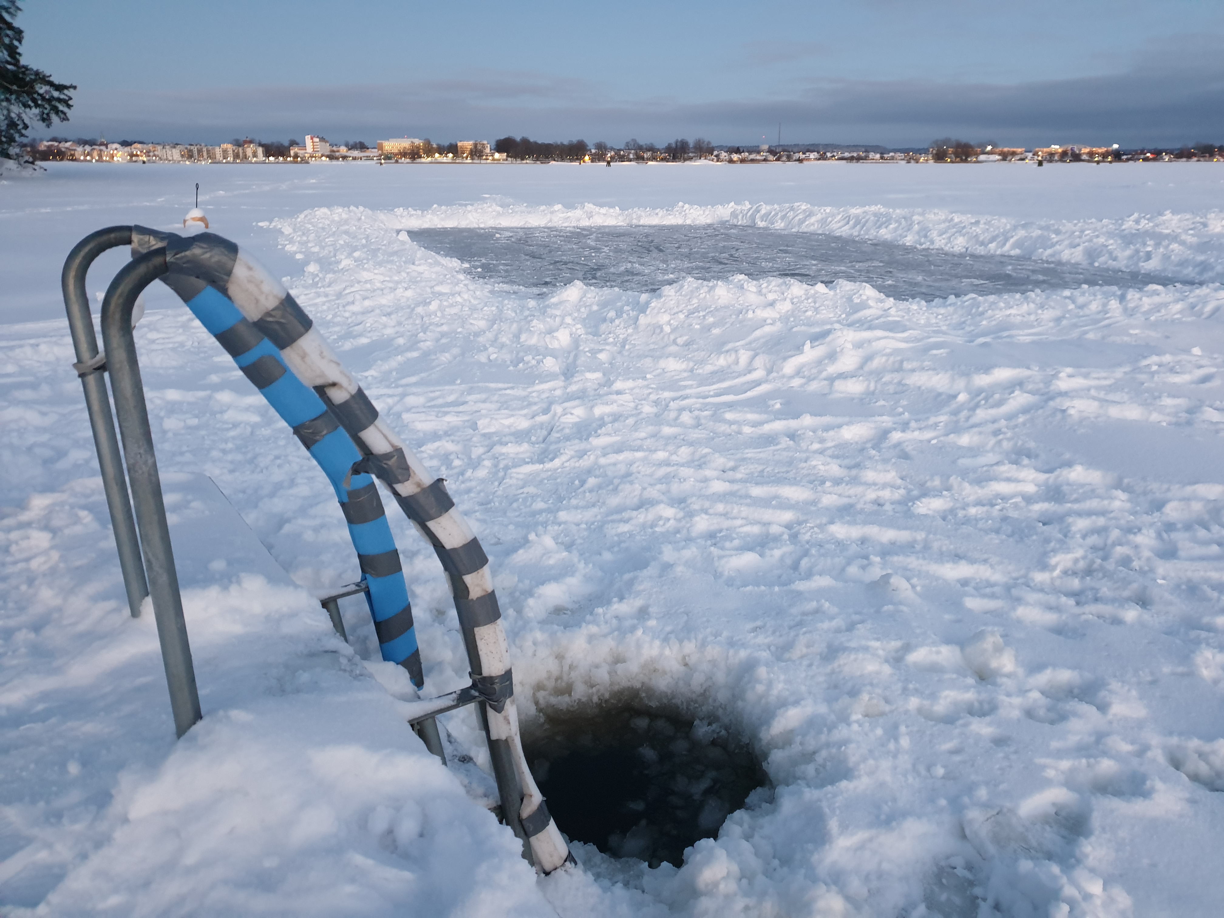 Gaddes brygga, Blåsut - Även här finns en stege ner till en vak i isen där man enkelt kan doppa sig. Här ser du ut över Vänersborg på andra sidan Vassbotten. I närheten finns också en yta där du kan åka skridskor.